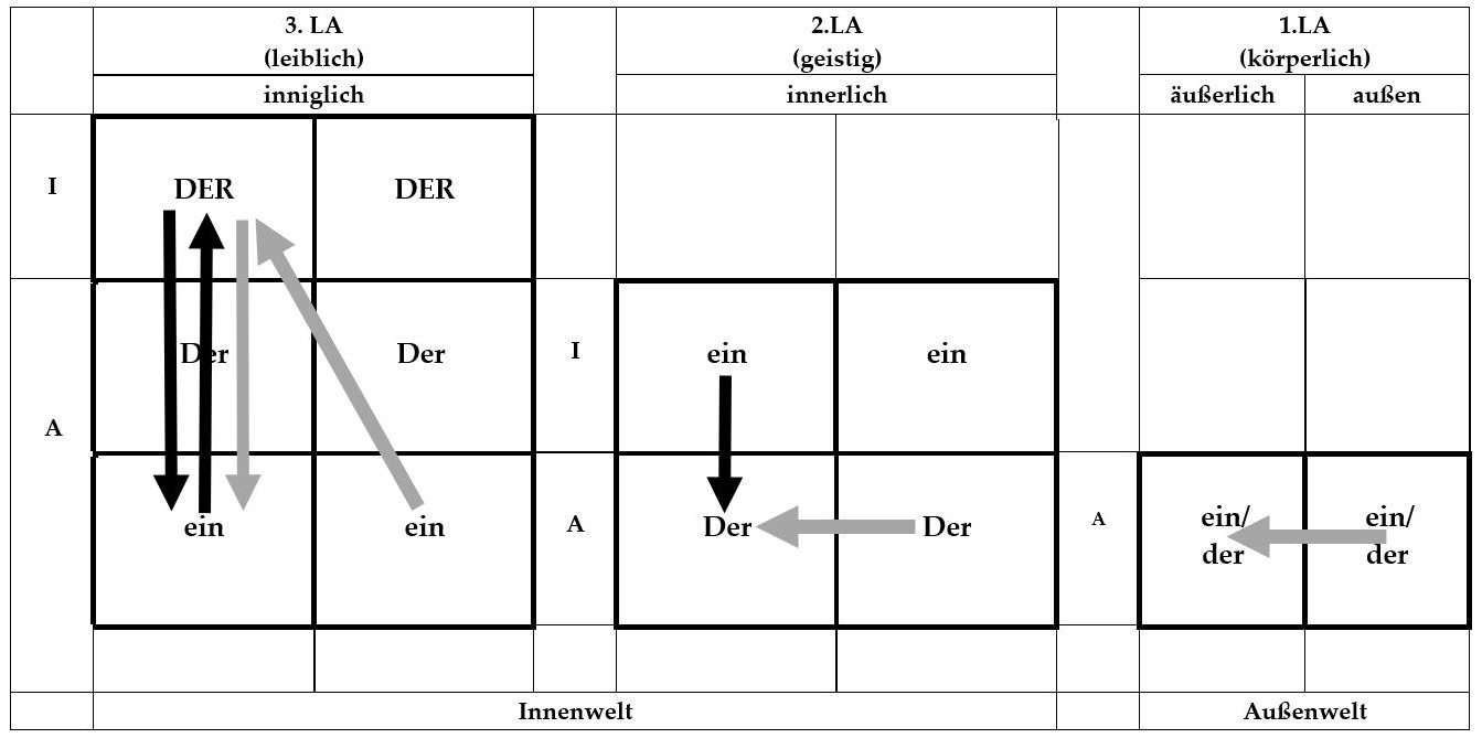 Um den weiteren Satzverlauf zu verstehen, ist es ratsam, auch den Werdegang und Positionswechsel des ATlich guten Menschen sowohl leiblich als auch geistig zu betrachten und ebenfalls in Beziehung zu setzen. Der ATlich gute Mensch von außen, der ganz am Anfang außen und innen betrachtet und erkannt wurde (Exos-LA), wird äußerlich als auch in der eigenen Innenwelt sowohl geistig als auch leiblich überlegt und erwogen (Esos-LA). Der Eingang jenes ATlich guten Menschen von außen findet im Geistigen und Leiblichen unten statt, wo der dem Markioniten von vorne, also im vorderen Bereich, präsentiert. Das ist die 1.Stufe der Kontaktaufnahme, bei der eine Übernahme noch nicht erfolgt ist. In der 2.Stufe gelangt dieser gute Mensch in den eigenen Bereich, der im Geistigen ebenfalls unten ist, aber im Leiblichen oben. Und wie beim Bösen/NT wird auch hier der gute Mensch im Geistigen an Ort und Stelle noch weiter bis zur 3.Stufe gesteigert, so dass er im Leiblichen ebenfalls von oben nach unten gelangt. Folgende Grafik soll die einzelnen Stufen mit ihren jeweiligen Positionen für den guten Menschen (graue Pfeile) und für den bösen Menschen (schwarze Pfeile) verdeutlichen: